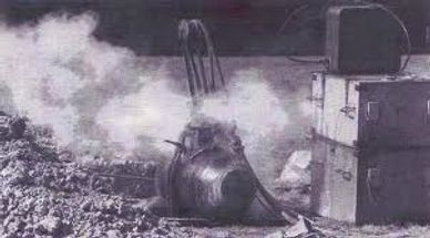 The steam generator must be watched in case "Blue Steam" is produced. Blue steam is thin and bluish in colour and is an indication of lack of water and overheating of the copper coil. The correct steam is a thick cloud with plenty of moisture as shown in this picture of a Bomb Disposal Operation in the 1950's.