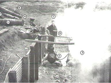 A flat circular metal band about 2 feet in circumference, 2 inches wide and 3/16ths of an inch thick had 3 metal stays 30 inches high which formed a cone connected to a small metal platform to which a vacuum pump was attached.  The pump had a gauge fitted to a connector outlet on the pump body.  A 5/8th inch rubber tube was connected to the outlet with a jubilee clip.  4 feet along the rubber tube a single bar tap is fitted known as tap "A".  18 inches from this tap a tee piece is fitted.  On the right angle bit of the tee, another 12 inches of rubber tube is fitted to which another bar tap is also fitted known as tap "B".  A further 18 inches of rubber tube is fitted to the tap and inserted into a jar containing 15 fluid ounces of immunising liquid. To the other end of the tee, 3 feet of rubber tube connected to a bronze collet with a rubber washer to fit on the fuze head.