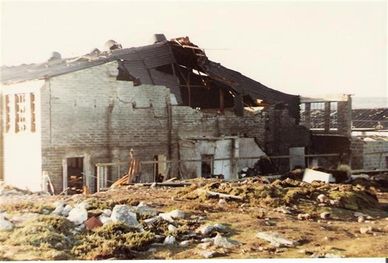 On the 28th May news reached the Unit that the Parachute Regt had captured Goose Green and its airfield. A decision was reached after consultation with Wg Cdr Traverne, the RAF LO on HMS Fearless, to move to Goose Green to clear the airfield for possible Harrier Operations and to assist in the clearance of the settlement. All equipment, except the vehicles were flown into the settlement by helicopter. RE search teams swept the area for UXOs, which included ammunition stocks, minefields and large quantities of “home brew” napalm in weeping containers both in the settlement and on the airfield. These were moved to the airfield and WO D. Trafford organised demolition. Fuzing units from cluster bomblets were removed , the cluster bomblet attached to the napalm container, and the whole linked with a Det Cord ring main. The ensuing explosion lifted a fireball some 500 feet in the air.